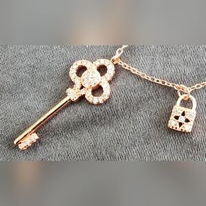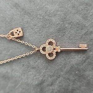 This exquisite rose gold key pendant necklace adds a touch of elegance to any outfit. The intricate design features sparkling accents, perfect for any occasion.