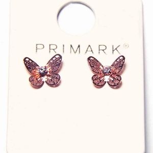 Women's rose gold colored metal and rhinestone butterfly earrings