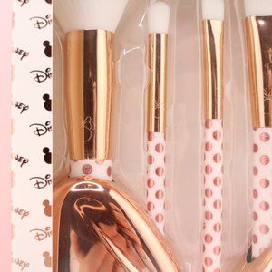 These are brand new in the box Rose Gold Minnie Mouse Makeup Brush Set. This adorable set features (1) metallic rose gold Minnie Mouse brush holder, and (5) assorted makeup brushes. Each brush is detailed with metallic rose gold polka dots, Minnie Mouse etched rose gold toned hardware, and soft white bristles. This set comes with a large powder brush, angled foundation brush, foundation/concealer brush, eyeshadow brush, and eyebrow brush. High-quality Disney x Primark exclusive.