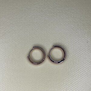 This stylish pair of small, thick huggie hoop earrings features a continuous line of sparkling accent crystals along the outer edge. They are finished in rose gold and marked as S925, indicating they are sterling silver. They click securely into place for a comfortable fit that "hugs" the earlobe.