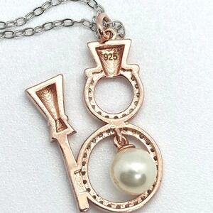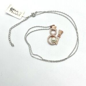 The pendant of this winter themed necklace is a rose gold tone snowman cutout, with a broomstick and top hat. Encrusted in the circles of the snowman are tiny clear CZ crystals, and in the bottom circle of the snowman hangs a faux white pearl. The charm is free-floating on the s925 dainty chain necklace. 925 is engraved on the back of the snowman's hat and on the closure clasp. Spring ring clasp closure. The rose gold plating may wear off with continuous wear, but underneath is 925 sterling sliver.