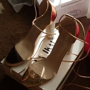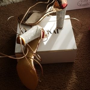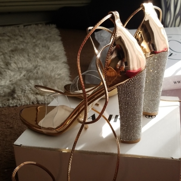 Clear strap, rose gold heels! Cute and comfortable. Very Sparkly heel. Comes with bags for shoes.