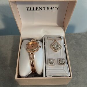Add a touch of elegance to any outfit with this stunning Ellen Tracy jewelry set. The set includes a cushion-shaped watch, necklace, and earring, all in beautiful rose gold. The stunning silver color of the set is perfect for any occasion, whether it's a special event like a wedding or anniversary, or an everyday accessory.