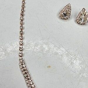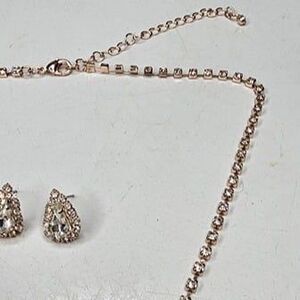 GORGEOUS! Rose Gold tone backing features glass rhinestone tennis style necklace with double strand and teardrop pendant. Teardrops are facet cut and pronge set on the necklace and earrings; accent stones are square cut. Lobster clasp closure; measures 18" long with a 3" extender. Earrings: 1/2"long x 1/3"wide.
