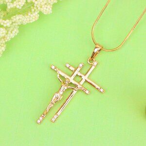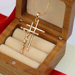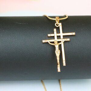 Elegant layered cross design featuring detailed crucifix and stone highlights.