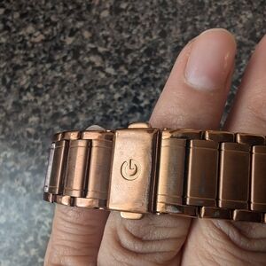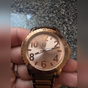 Stylish gold watch featuring a rose gold dial. Perfect for any occasion.