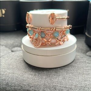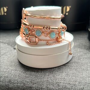 Elegant rose gold bracelet set featuring turquoise accents. Perfect for adding a touch of sophistication to any outfit.
