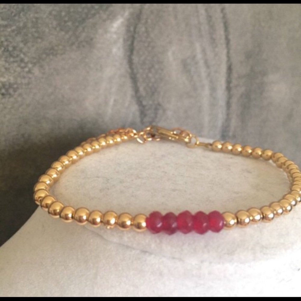 This super delicate bracelet is composed of round rose gold fill metal beads, with a small center segment of gorgeous little faceted rubies. The rubies are such a vibrant deep red shade - natural and undyed.