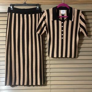 Gorgeous two piece set, collared button down short sleeve top with stretch midi pencil skirt with semi pleats/accordion stretch. Vertical striped very flattering, shimmer fabric in dusty pink/rose color