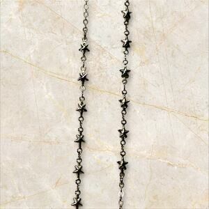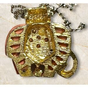 Rose gold-tone necklace with rhinestone bedazzled pink/peach elephant pendant. Longer length. Chain measures approximately 28” long. Elephant pendant is 1.5” x 1.5”.  Elephant is resin with goldtone trunk and tusks. Saddle has rhinestones.  There are some small stars on the chain.  Lobster claw clasp shows some wear and tarnishing.