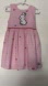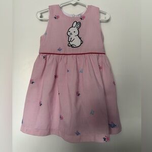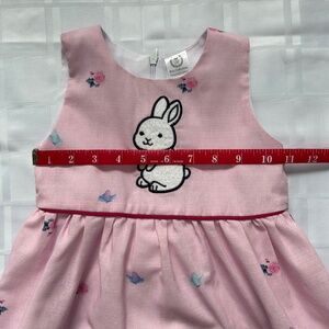 Rose dress, in excellent condition. Fit and Flare style with sashed waistband, lined interior, 10” zipper closure on back, butterfly print fabric with bunny decal detail on front. No size marking, fits 12 months in my opinion (measurements in photos).