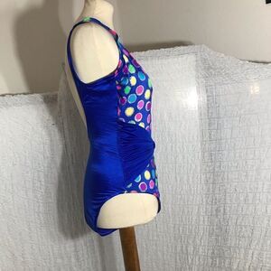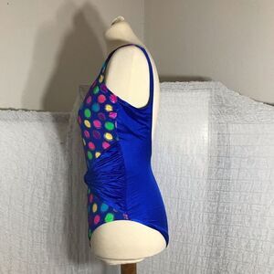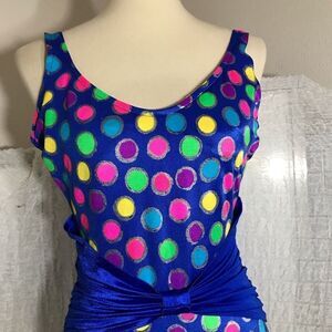 Vintage 70's Blue Neon Polka-Dot one piece swimsuit. Pre-owned in overall good fair uses condition. Please refer to pictures for best description and condition verification