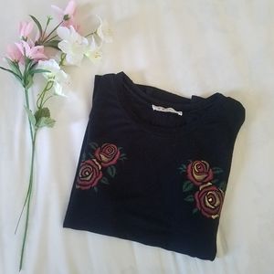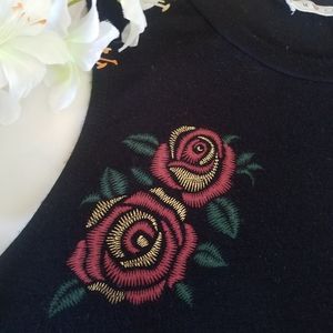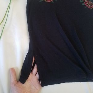 A soft black muscle tank with printed red & gold rose detailing & small side slits on either side; great for a casual outfit or to dress up & go out in! Worn a couple of times & in great condition!