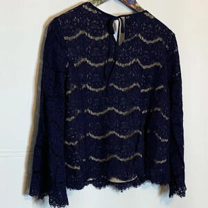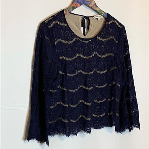 Rose & Olive Blouse Womens Size Medium Lace Flutter Bell Sleeve Navy Lined Nude