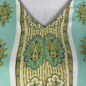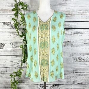 Rose + Olive Blouse Tank size Medium Mint Green Gold Paisley Pleated Sheer Boho
