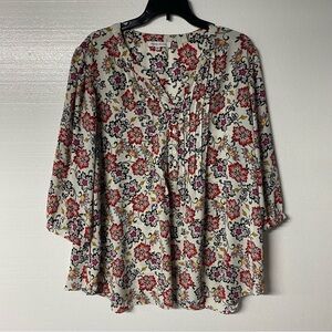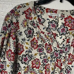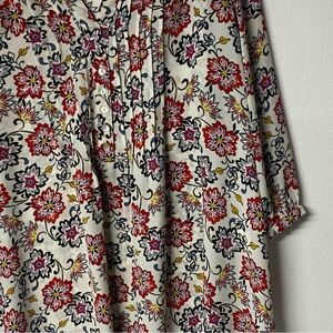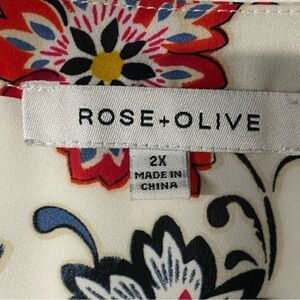 Rose + Olive Blouse Women 2X White Colorful Floral V Neck Tassel 3/4 Sleeves