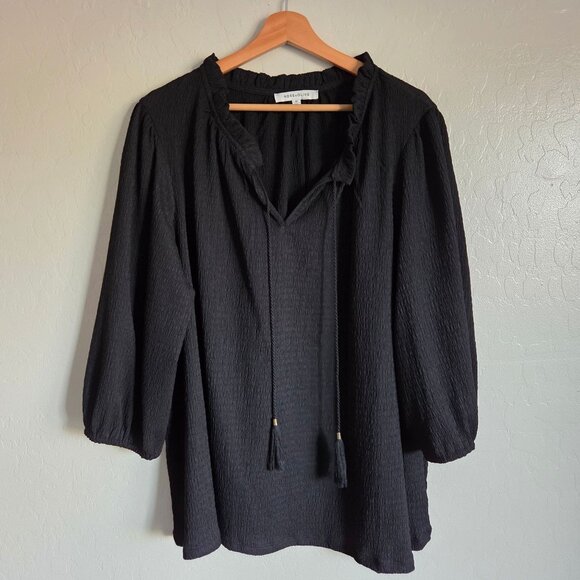 Rose + Olive Crinkle Puff Sleeve Tassel Tie Blouse V-Neck Black 2X Office Career