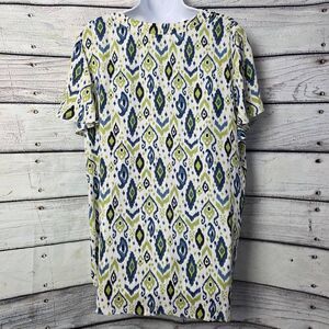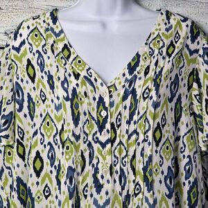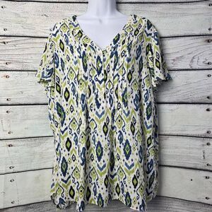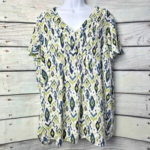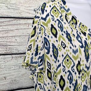 Rose + Olive women’s short sleeve blouse, size 1X. Features vibrant green, navy, and white ikat print, pleated front detail, and relaxed fit. 100% polyester. Lightweight and comfortable for any season.