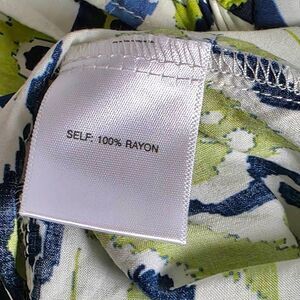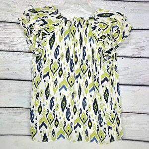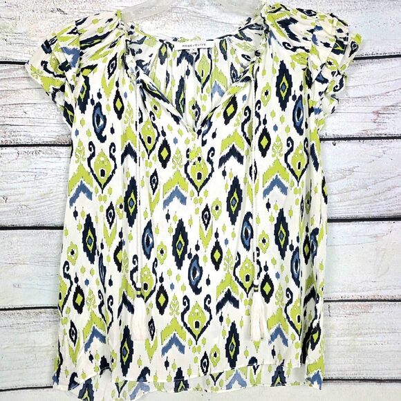 Rose + Olive women’s lightweight blouse in a vibrant lime, navy, and white ikat print, size Medium. Made from 100% rayon for a soft, flowy drape. Features ruffle cap sleeves, split neckline with tassel ties, and relaxed fit. Perfect for spring and summer styling.