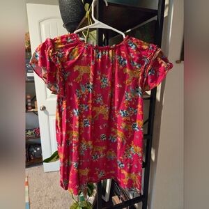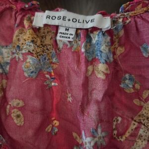 This Rose & Olive blouse features a vibrant pink hue with delicate blue floral accents, perfect for adding a pop of color to your wardrobe. The short sleeves and ruched, ruffled design offer a stylish and comfortable fit, ideal for warm weather. Crafted from lightweight fabric, this top is both chic and breathable.