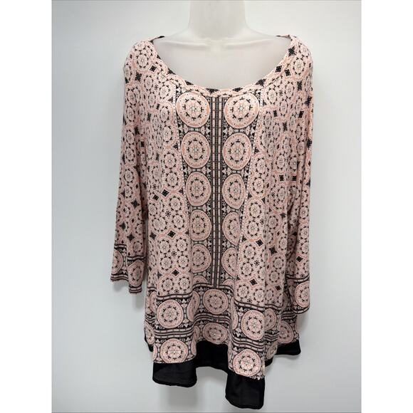 Rose + Olive Scoop Neck Top Womens 1X Pink Floral Bell Sleeve Knit Cottagecore