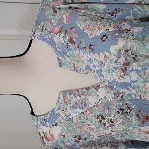 Rose + Olive Size M Muted Blue, Pink, Burgundy, Green & White Floral Tie Front Blouse. Gorgeous Muted Colors, Round Neckline with V-Notch. Dolman Sleeves, Back Pleats. Crepe-ish Fabric. Excellent Condition, No Holes, Rips, Stains or Snags. Please refer to measurements in photos to ensure proper fit.