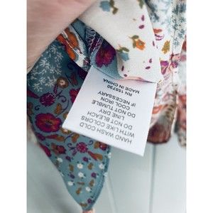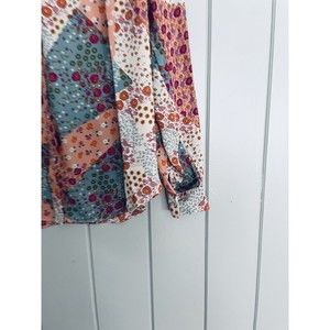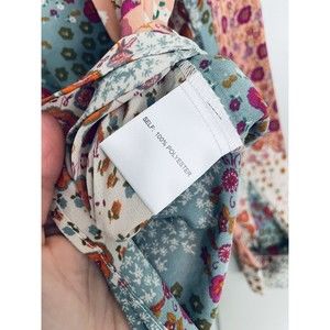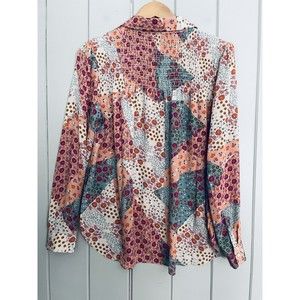 Button front chiffon blouse by Rose + Olive. Faux patchwork print in pink and blue. 100% polyester chiffon. Smocked back. Size medium. Excellent condition.