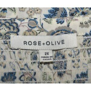 This Rose + Olive blouse features a stylish V-neck, blue floral pattern, and 3/4 sleeves with smocked fabric and button detailing. Perfect for a casual look, this plus-size top offers comfort and chic style.