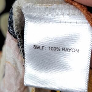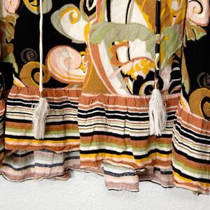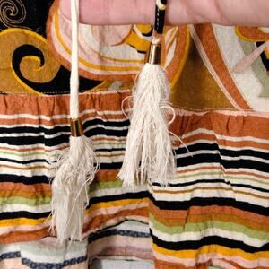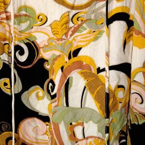 Rose + Olive sleeveless blouse in a flowing semi-sheer chiffon with bold Mediterranean-inspired scroll print and tassel ties at the neckline. Women’s size XL. Lightweight and breezy with a relaxed fit, gathered neckline, and multicolor stripe hem that gives it texture and motion. It's fully lined through the body with a soft drape and plenty of color pop.
