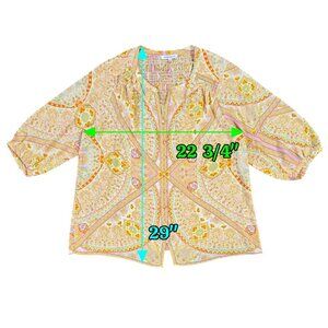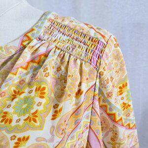 Good used condition, with no stains or tears. An artsy yellow blouse with florals, paisleys and other boho shapes. Has a split neck, decorative buttons, and smocked upper areas. Popover style. 3/4 sleeve.