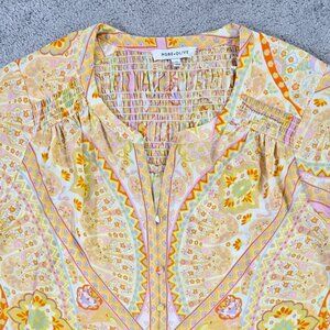 Rose & Olive Yellow Floral Paisley Split Neck Popover Blouse Boho Hippie