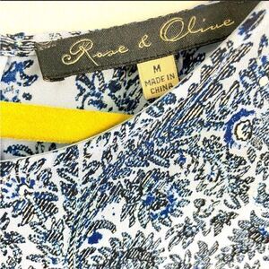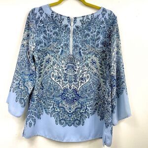 Rose & Olive paisley blouse Med light blue and black, back zipper, side slit, spacious long sleeves for a relaxed fit and look, In in great condition.