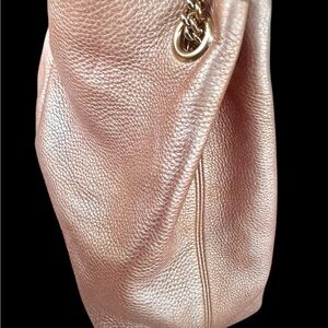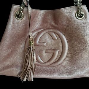 This beautiful pink Gucci Soho is in excellent condition with very minor signs of wear. The pin is close to a rose gold color. It is really gorgeous with a hint of shimmer. . The outside shows very minor signs of wear and the handles are in excellent condition. The handles are adjustable to make it a shoulder strap or crossbody. The linen interior is clean with no signs of wear. This is a gorgeous bag.