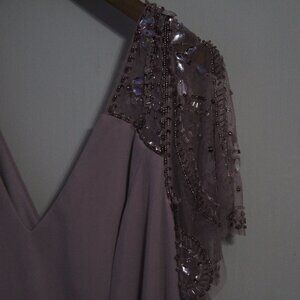 Details: Beaded translucent puffy sleeves, ruffled skirt, zip closure