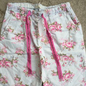 Pink rose print with green buds on very pale blue soft brushed cotton flannel pants. Elasticized waist with 0.75" pink and silver draw cord. Pockets. Button fly (one button missing). Size XS. Waist stretched: 35”. Hips 40” Front rise: 8.75” Inseams: 31”. Side seams: 40” NWOT