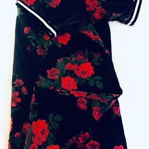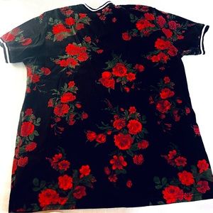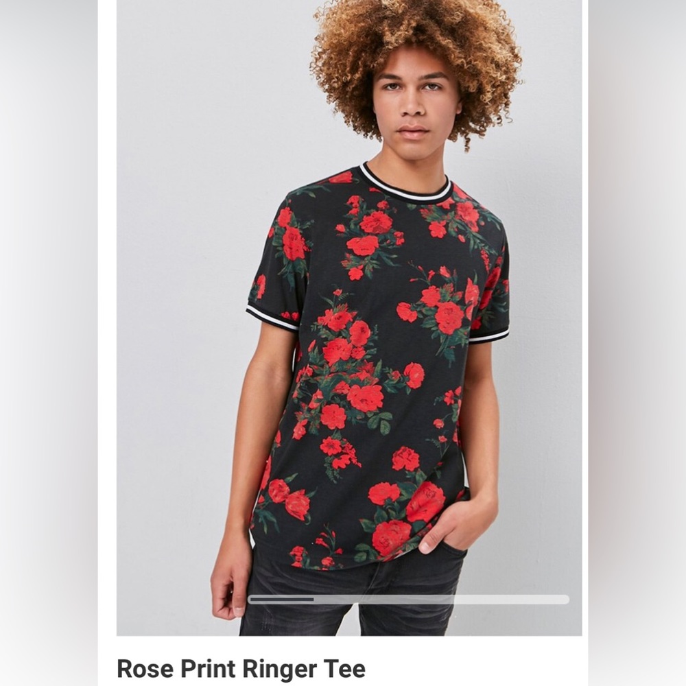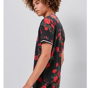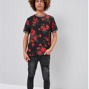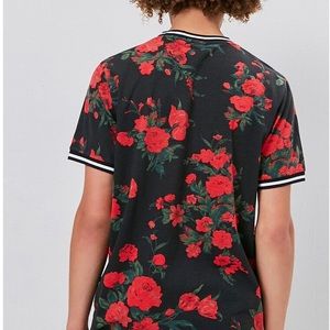 A knit ringer tee featuring an allover rose print and varsity-striped ribbed trim at the crew neck and short sleeves.