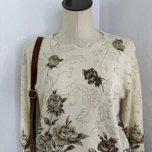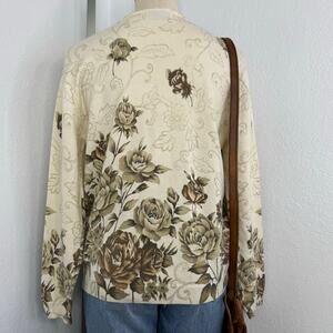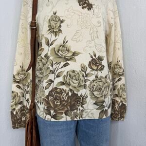 Rose Print Wool Blend Crewneck Sweater Cream Brown Size Small, Good Condition
