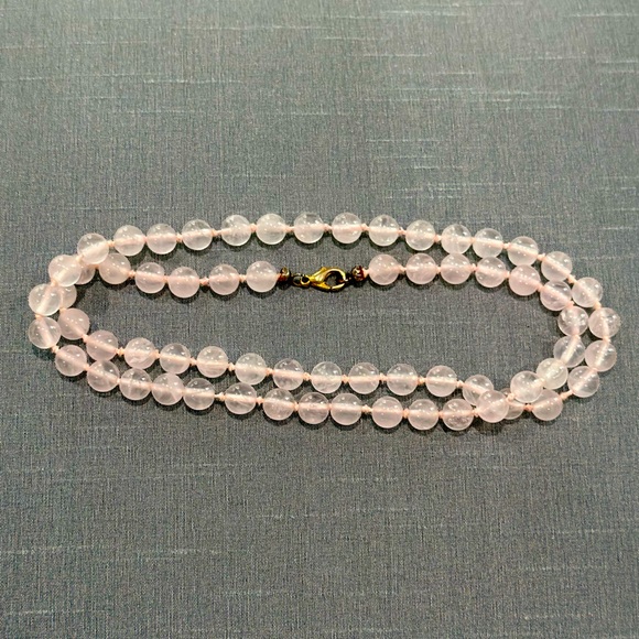25” long on knotted cord. Beads are ~8mm. Rose quartz is the stone of universal love.