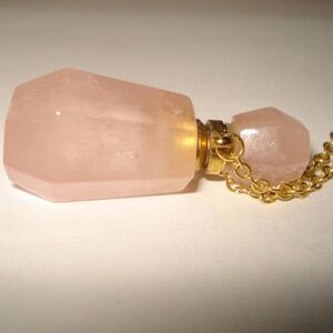 Gold tone metal chain- 20", rose quartz bottle is 1.5" tall, 3/4: wide, never used, signed Essential Ritual.