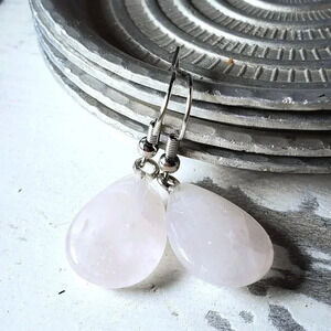 Rose Quartz Gemstone Puffed Teardrop Handcrafted Pink Silver Dangle Earrings
