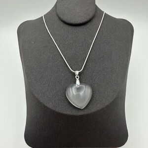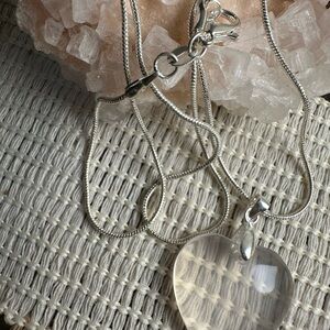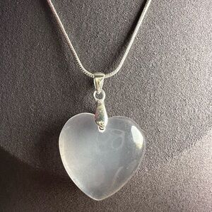 Very light natural pink rose quartz heart pendant on silver 925 bail and 22” silver stainless steel chain with lobster clasp closure. Pendant is about 3/4” tall and wide at widest part. It’s hard to capture in the photos, but it has a very light pink tint to it.