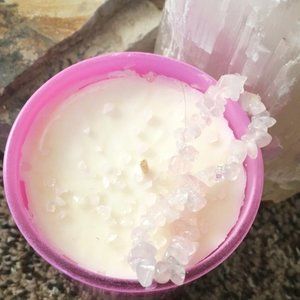 Rose Quartz gemstone candle with Rose Blossom scent has gems to keep after the candle burns down. Soy candle in a "Love You Mum" pink jar. Limited Edition item in a gift box, imported from the UK. Comes with a Rose Quartz bead bracelet, keep it for yourself or give it as a gift! Great gift for Easter, Mother's Day, birthday, or just because!