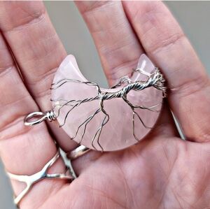 Rose Quartz ✦ Moon Crystal Necklace ✦ Wire‑Wrapped Tree of Life Pendant NWT