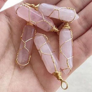 Rose Quartz Natural Gemstone Hexagonal Point Gold Wire Wrapped Pendant