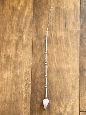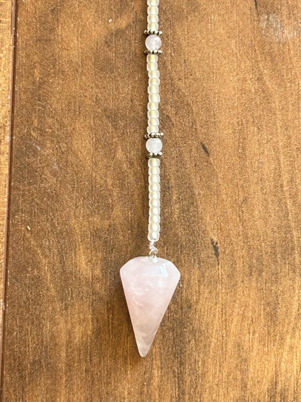 Rose quartz pendulum beaded with selenite and rose quartz beads. Length is 11”