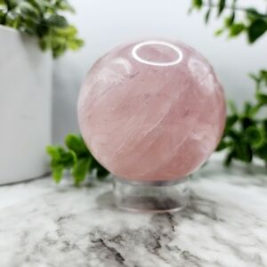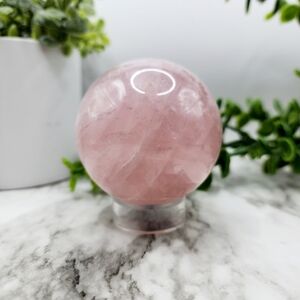 This beautiful Rose quartz sphere has a nice touch of soft pink to add to your collection. This sphere is approximately 63.5 mm and weights 3 ounces. Spiritually Rose quartz is known for self love and help in healing the emotional heart.