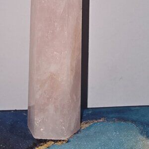 This is a beautiful rose quartz tower, perfectly sized—not too big and not too small. It features lovely coloring throughout, and the tip is intact and well-preserved. However, there is one note: it has a small surface crack. While not deep, this crack is slightly visible upon close inspection and can be felt with a fingernail or finger if you choose to touch it.