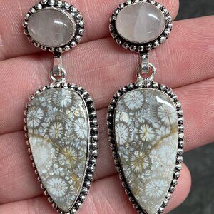 Earrings of natural rose quartz and fossil coral gemstones in 925 silver frame settings with 925 wires.