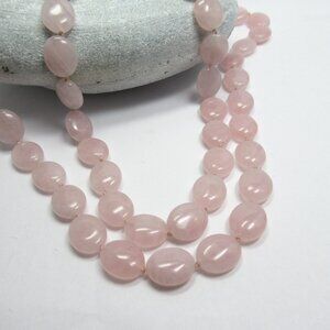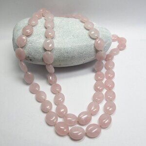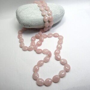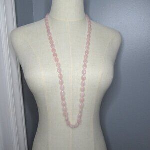 This listing is for the hand knotted Rose Quartz gemstone bead necklace pictured. It is new and has never been worn. It is 37 inches of continuous knotted beads. It comes with a hinged necklace shortener that allows for it to be worn as a 18 inch double strand necklace. This necklace was hand knotted by me using nice quality soft pink Rose Quartz oval gemstone beads. It is knotted on durable pale pink Griffin Nylon cord. This necklace has a classic vibe that would work year round. It can be worn long like a flapper necklace, knotted in front, or doubled with the shortener.