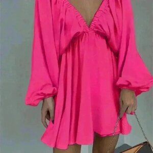 Rose Red Sexy Women's Solid Colored Deep V-Neck Lantern Sleeve Backless Dress